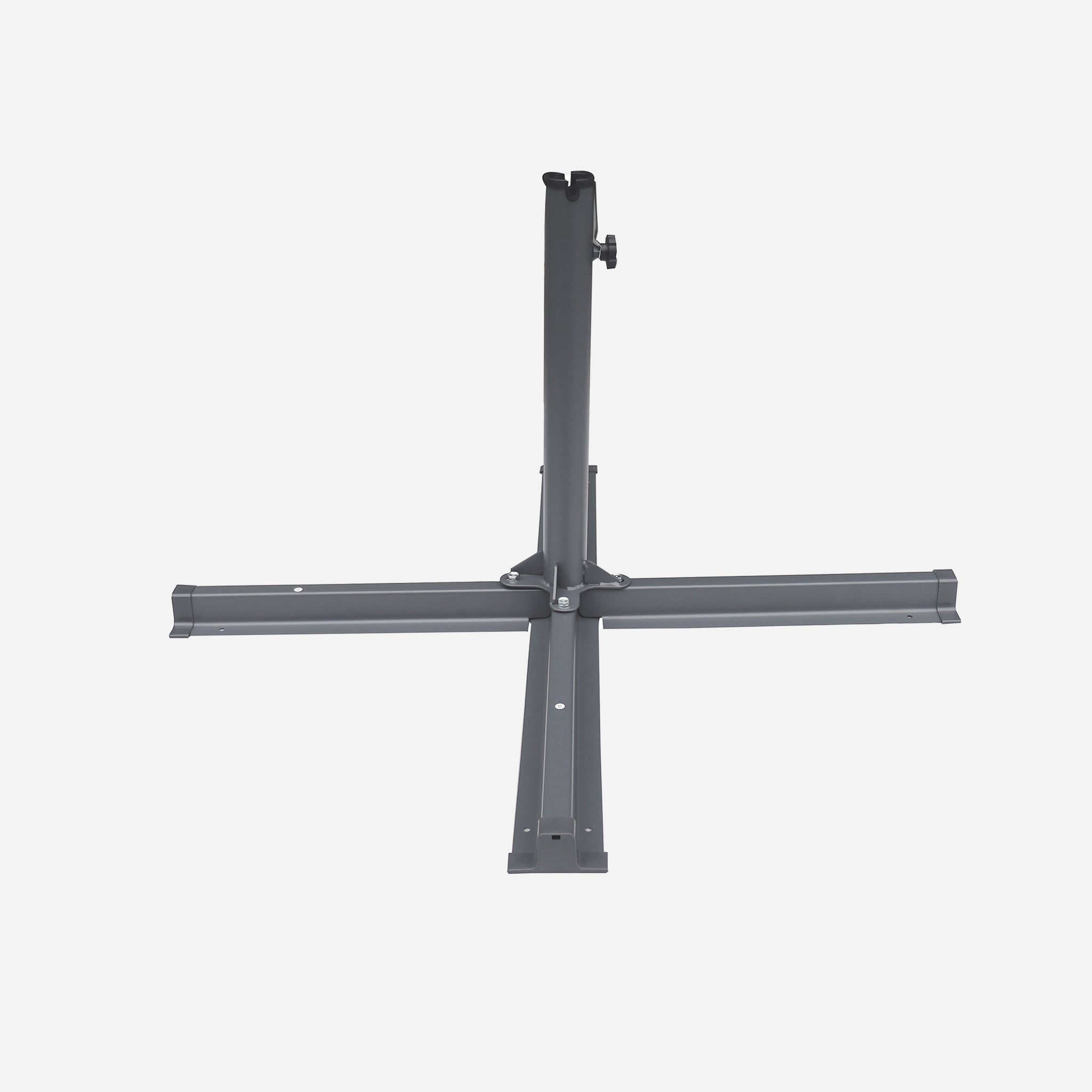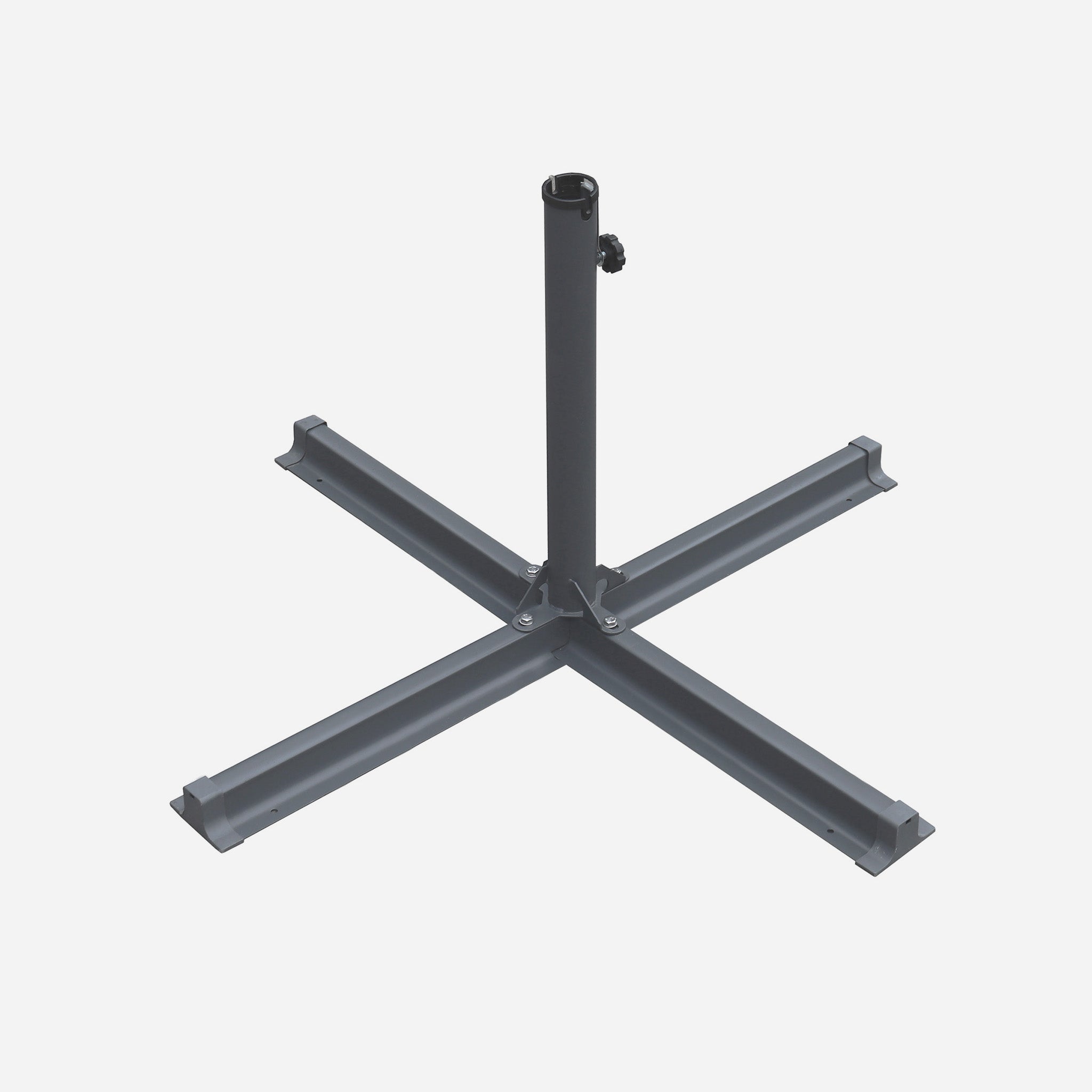 The Fogony cross base for the centre-pole parasol is made of dark grey steel, coated with anti-rust paint.